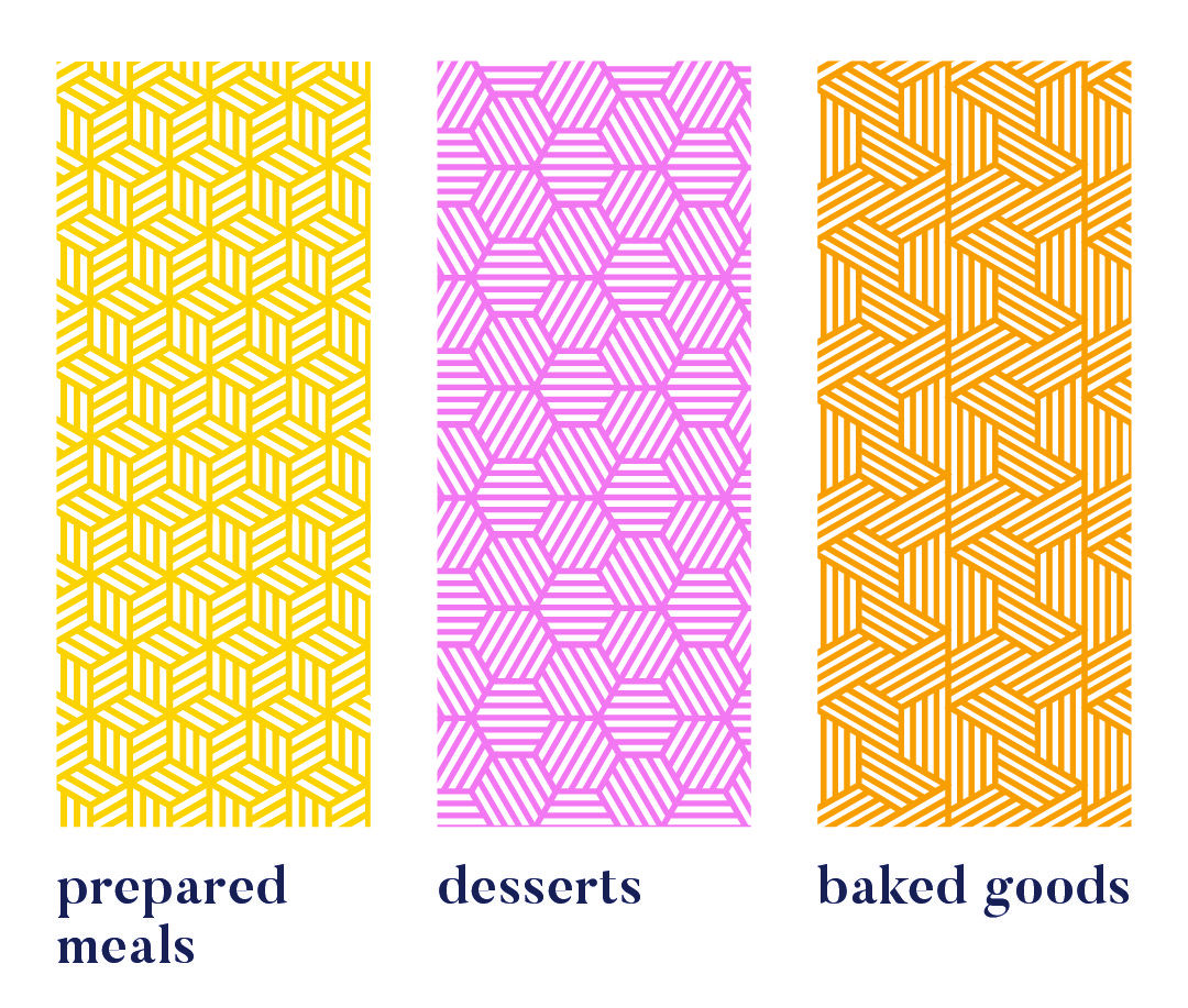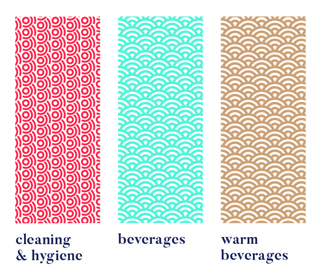 Colour variations within a pattern distinguish sub-products, like hot vs cold drinks or juice flavours. Cleaning & Hygiene products use a red pattern from the Supercare logo, signalling both chemical use and brand affiliation.